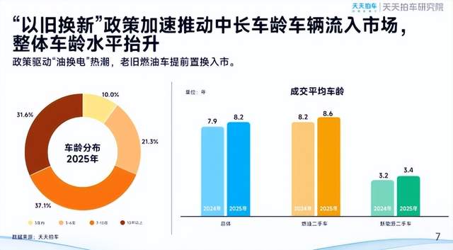 车龄结构上,“以旧换新”政策驱动下中长车龄车辆加速流入市场。报告显示,2025年二手车成交平均车龄升至8.2年,较2024年的7.9年增加0.3年。其中燃油二手车平均车龄8.6年,新能源二手车平均车龄3.4年,较2024年均略有小幅提升。