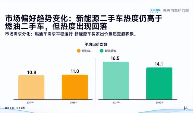 价格方面,对比异地交易与本地交易价差明显。2025年燃油二手车本地交易成交均价3.8万元,异地交易成交均价5.53万元;新能源二手车本地交易成交均价6.4万元,异地交易成交均价6.76万元。跨区域流通充分释放了二手车的市场价值,通过天天拍车平台,直连供给端和需求端,哪怕是高龄车或小众车也能凭借在线竞拍模式充分市场博弈,实现二手车价值合理兑现,有效发现车辆最优价值。